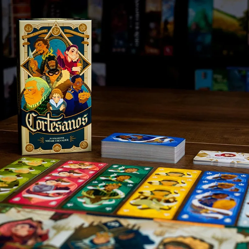 Cortesanos es un filler de cartas para 2-5 jugadores donde cada turno se juegan exactamente tres cartas: una en la mesa de la Reina para manipular el estatus de una familia, una en el propio dominio y una en el de un rival. Las familias apreciadas dan puntos; las repudiadas los restan. Las cartas de misión secreta y las de espía pueden voltear el resultado final