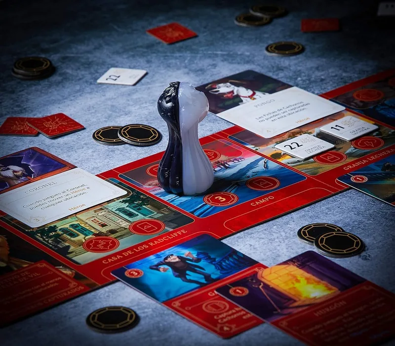 Cruella De Vil debe conseguir 99 fichas de cachorro en las casetas de Horace y Jasper. Los cachorros son tokens que están escondidos en su tablero y que tiene que ir descubriendo y moviendo a las casetas correctas. Cada cachorro que revela puede ser un cachorro real que suma al total o puede ser una pista falsa que no vale nada. La mecánica de revelación gradual genera tensión de anticipación: nunca se sabe cuántos cachorros reales quedan por descubrir. Perdita aparece en su mazo de destino e intenta recuperar cachorros de las casetas, lo que obliga a Cruella a defender sus posesiones además de expandirlas.